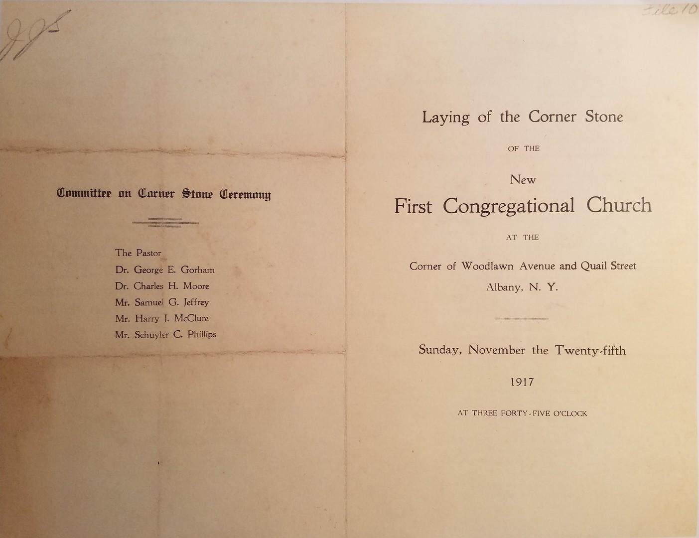 On November 25th 1917, the church cornerstone was laid with great ceremony which included the hymn “How Firm a Foundation.” Four of the church members who attended the same ceremony in the old church in October 1869 were present: Mr and Mrs David A. Thompson; Daniel Underhill; and Dr. Charles Moore. Architectural renderings were unveiled to the public and an article in the Albany Argus noted: