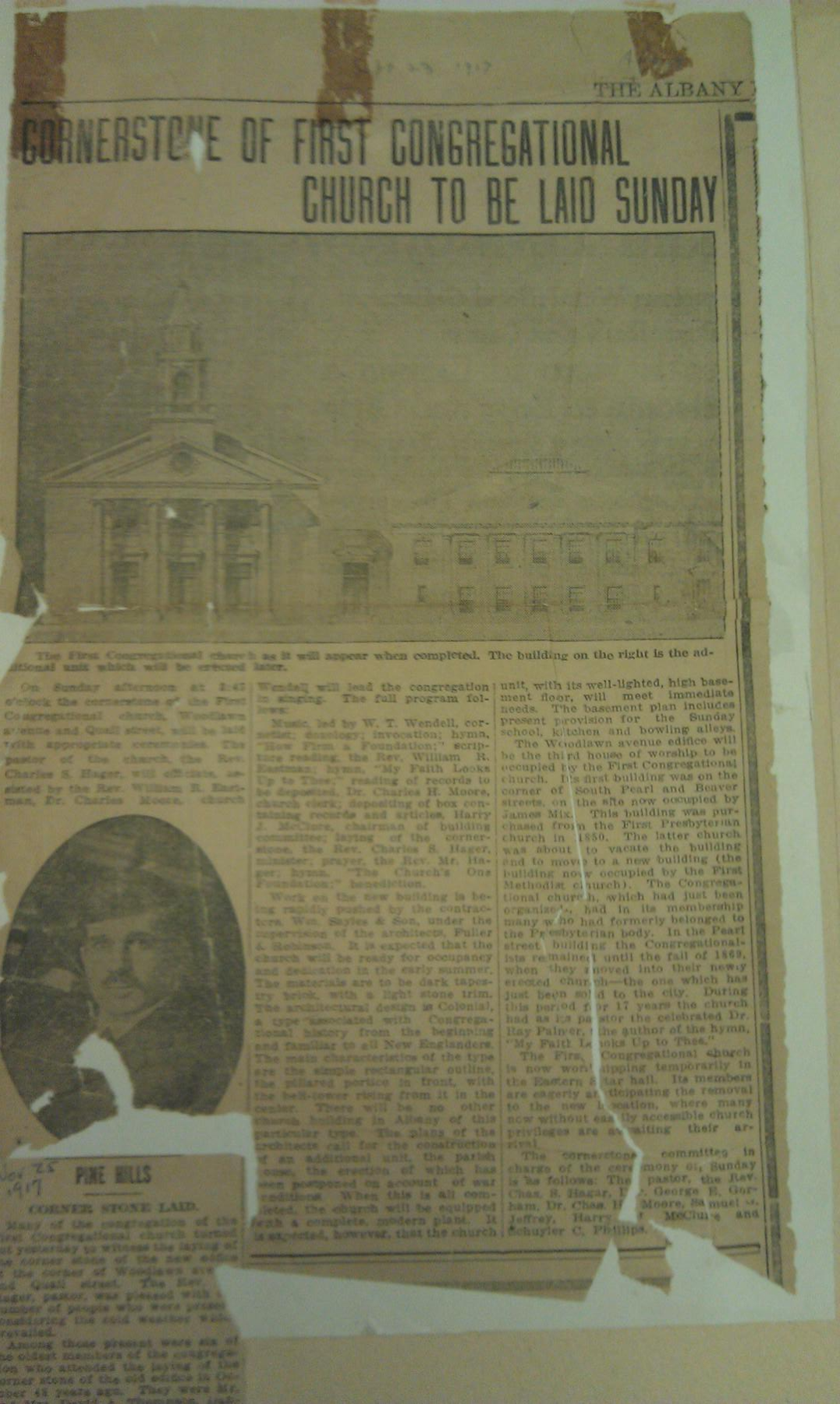 While the survey was underway in the Woodlawn area, progress had been made on the sale of the church building downtown. William V.R. Irving, Commissioner of Public Safety for the City of Albany, was looking for sites for a new municipal building and offered to purchase the property from the church. At its annual meeting on January 15th 1917, the congregation authorized the sale of the church property for $35,000, excluding building fixtures.
